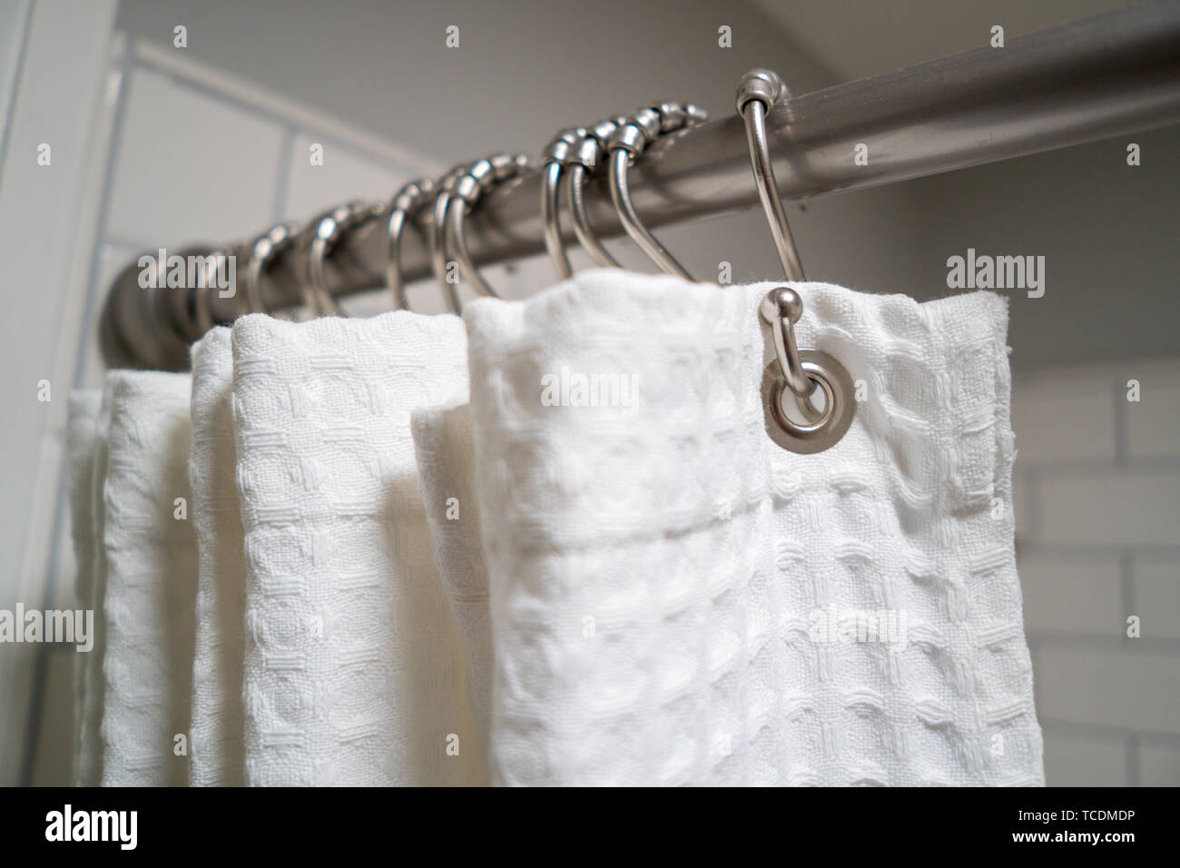 Decorative Luxurious Shower Curtain On Hooks Stock Photo