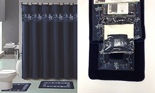 18pc Bath Rug Set Beverly Navy Blue Flower Bathroom Shower Curtain