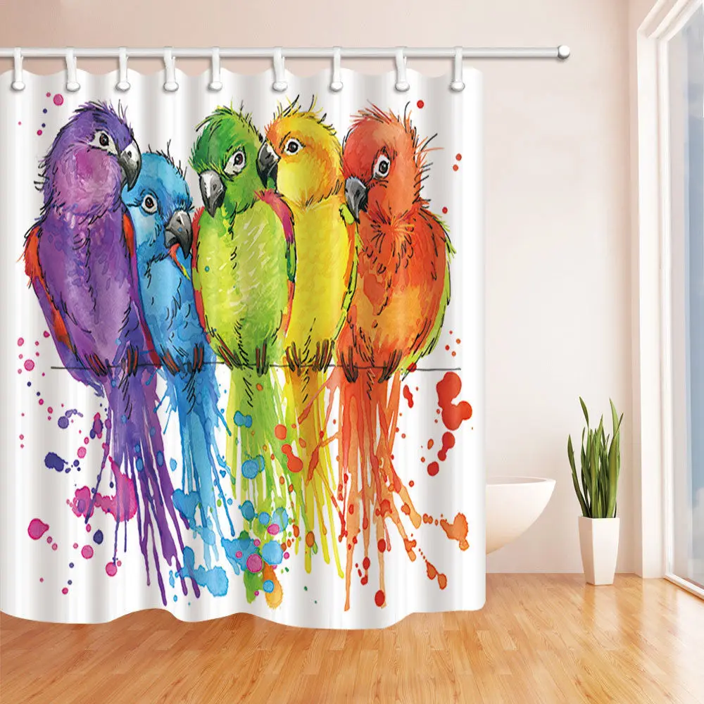 Funny Watercolor Painted Parrots Waterproof Fabric Bath Shower