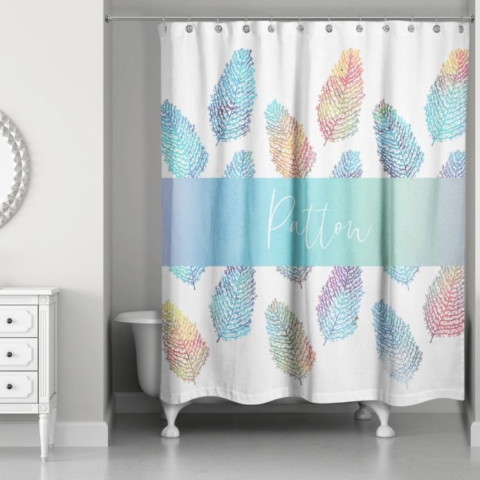 Feather Leaf Watercolor Personalized Shower Curtain In White Blue