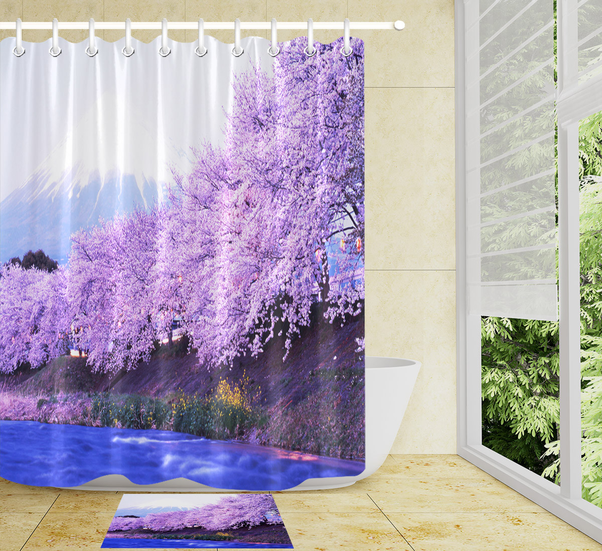 Purple Flowers Snow Mountain Scene Bathroom Waterproof Fabric