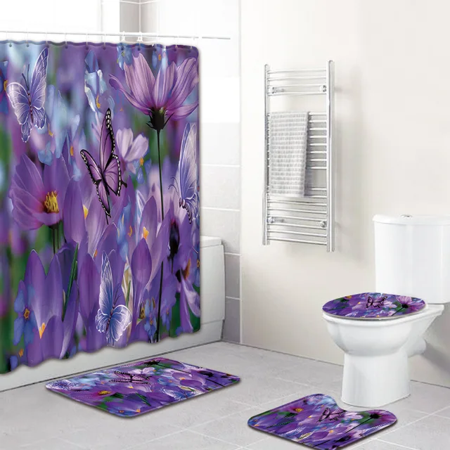 2019 Waterproof Bathroom Shower Curtain Toilet Cover Rug Mat Set