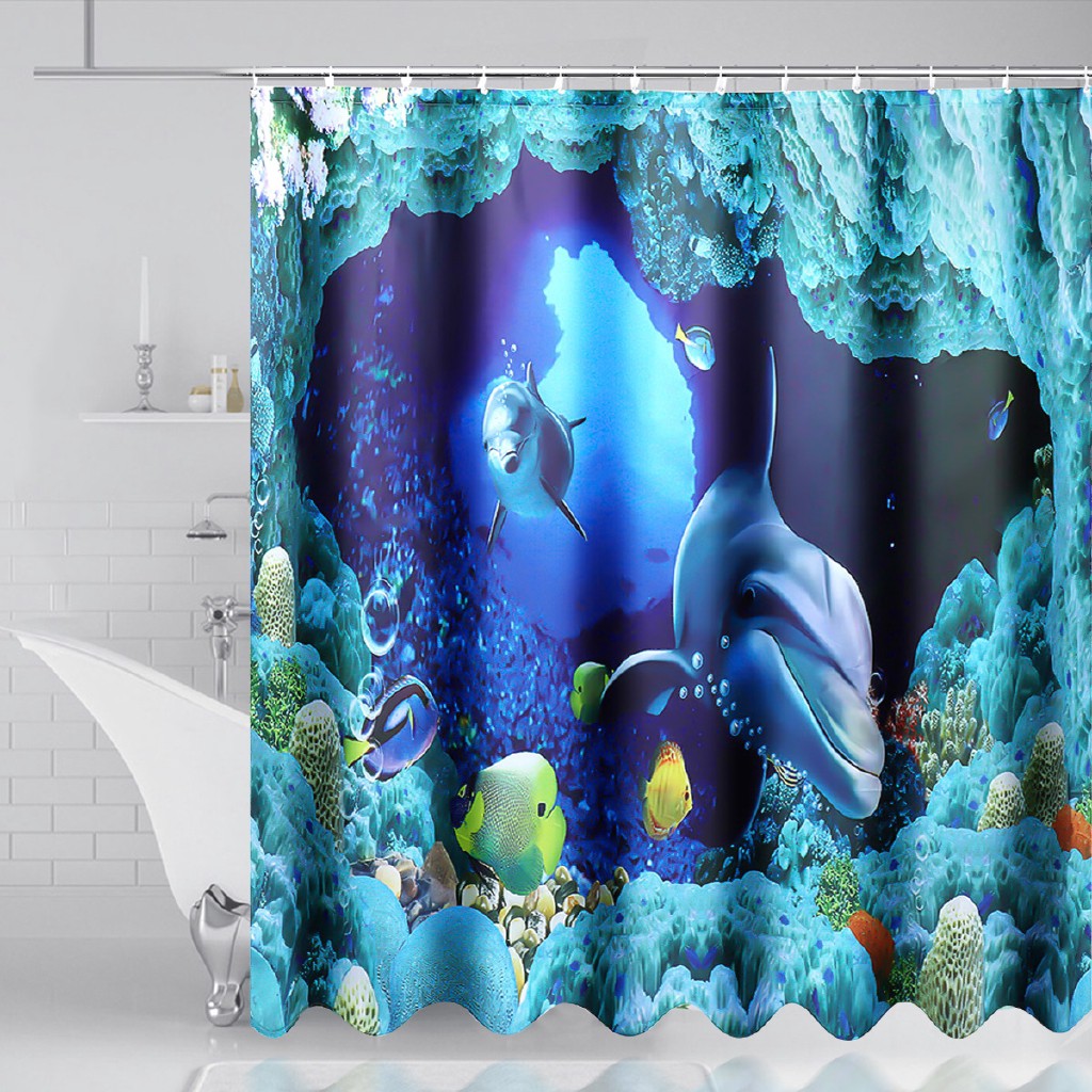 Blue Dolphin Deep Sea Waterproof Bathroom Shower Curtain 12 Hooks