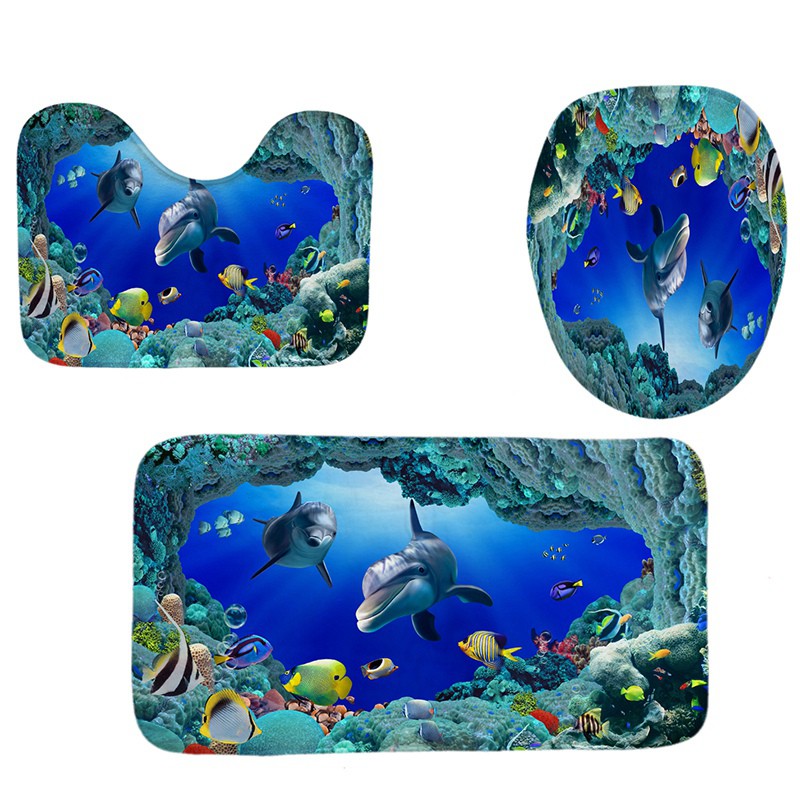 1 3 4 Pcs Bathroom Mat Set Ocean Dolphin Starfish Print Waterproof