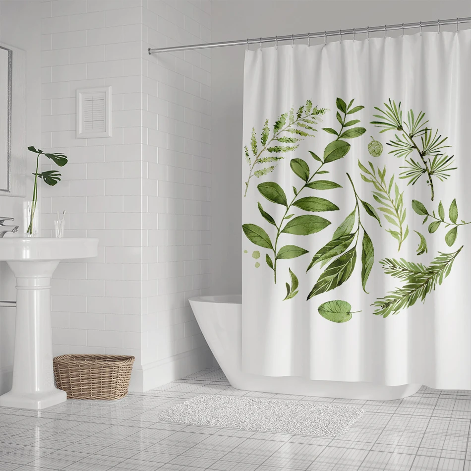 Green Leaves Shower Curtains Plant Print Bath Curtain Polyester