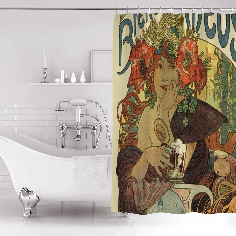 Alfons Mucha Art Nouveau Beer Ad Extra Long Fabric Bath Shower