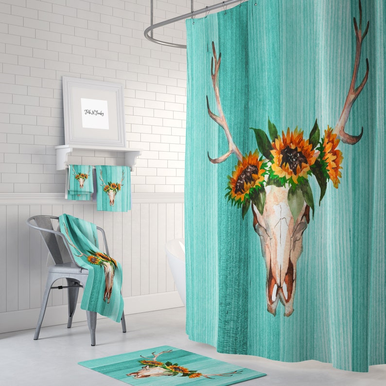 Turquoise Deer Skull Shower Curtain Antlers Sunflowers Etsy