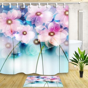 Floral Fabric Shower Curtain Set Bathroom Waterproof Lotus Flower