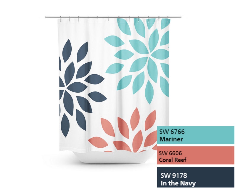 Shower Curtain Floral Flower Burst Bath Curtain Coral Navy Etsy