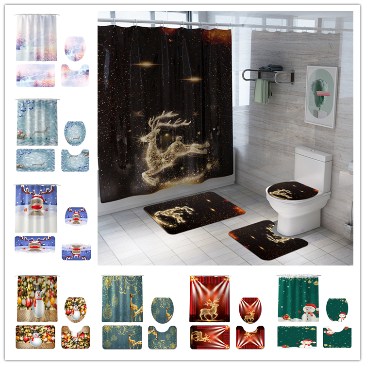 Ouneed 4pcs Christmas Shining Elk Print Bathroom Shower Curtain