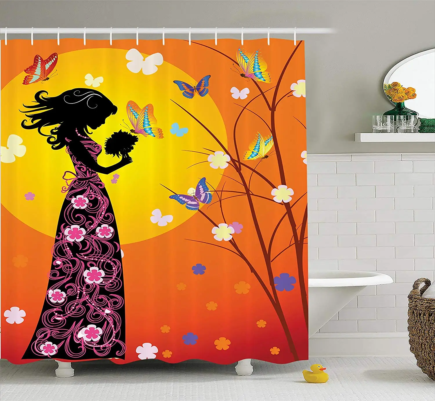 Teen Girls Shower Curtain Flowers Butterflies Silhouette Of Girl